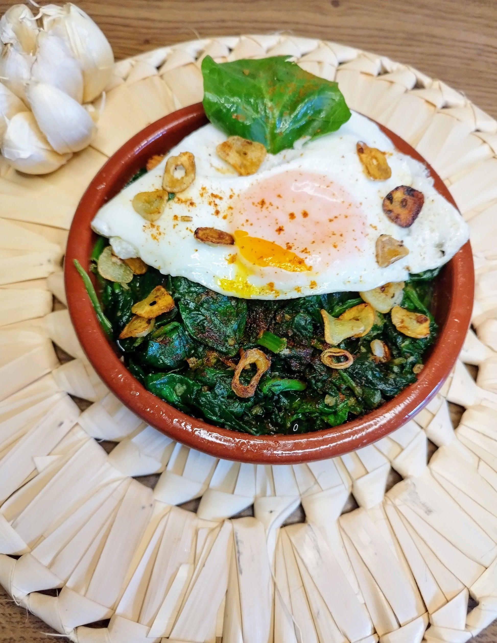 - Pon las espinacas en una sartén o cazuela de barro a fuego alto, con el majado que tienes reservado, removiendo hasta que hayan perdido volumen